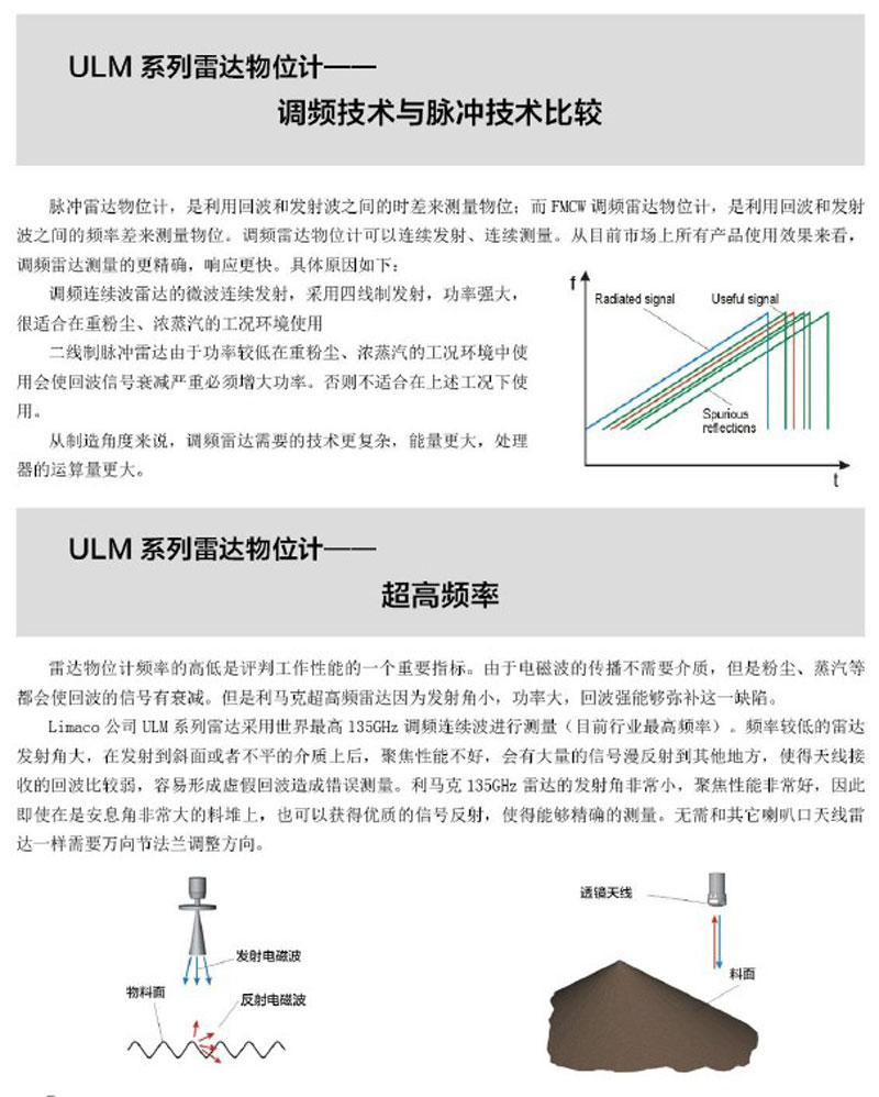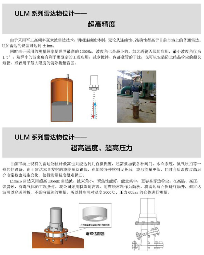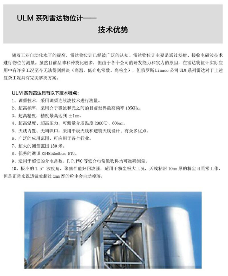 ULM 系列物位計適用于在各種復雜工況下的物位的測量,利馬克公司將會根據您的項目特點、工況和技術要求為您推薦和選擇最適合的雷達物位計和測量方法。